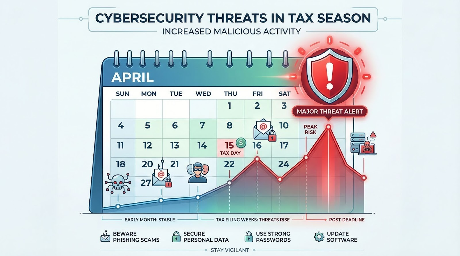 ALT Text: Graphic showing a spike in cybersecurity threats during tax season with a calendar and a red alert icon